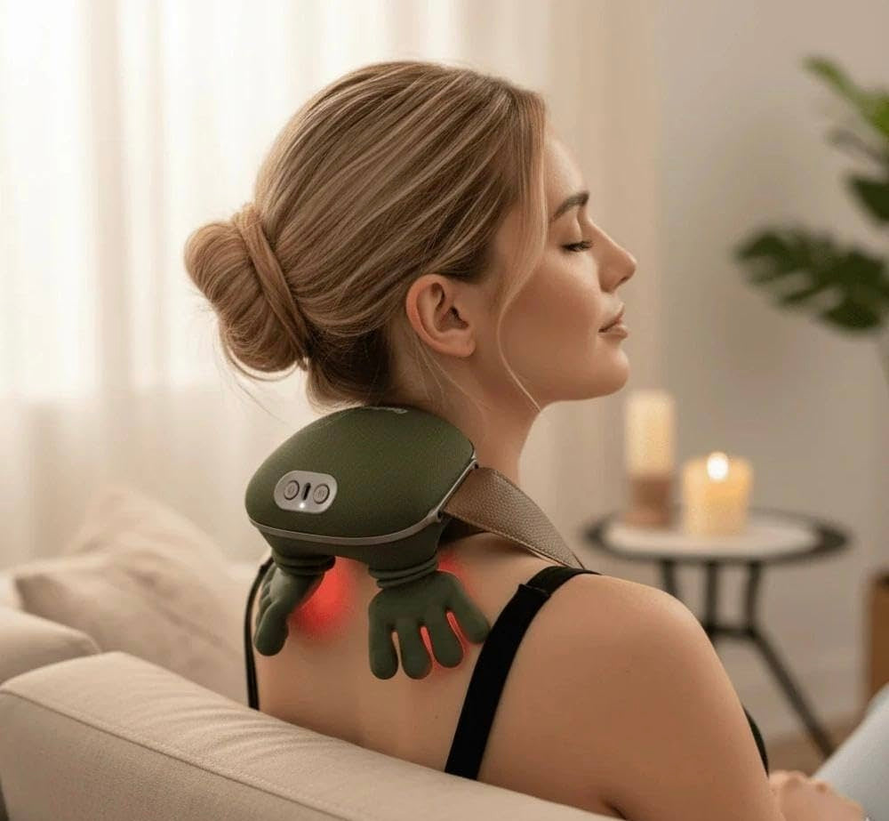 Las manos biónicas liberan la tensión profunda mientras el calor a 45°C penetra en el músculo. Sin citas. Sin esfuerzo.